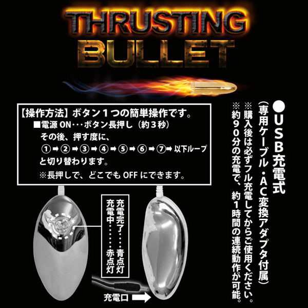 ●弾丸フォルムのシングルタイプ●メタリックなきらめきボディ●電磁石による反発力でピストン●ワンボタンの簡単アクション●電源…ON/OFFともに3秒長押し●振動…押すごとに7種切替(ループ)●専用ケーブルによるUSB充電式●フル充電(90分)で約1時間稼働●充電完了は一目瞭然(赤→青)。