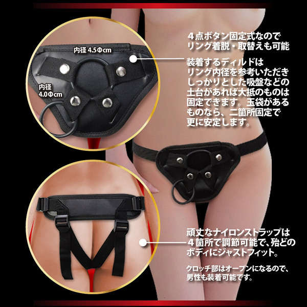 4点ボタン固定式なのでリングの着脱&取替えも可能!各リング内径4.5cm以内であれば、吸盤などのしっかりとした土台があるディルドなら大抵のものは固定可能!玉袋があるディルドなら2ヶ所固定で更に安定します。