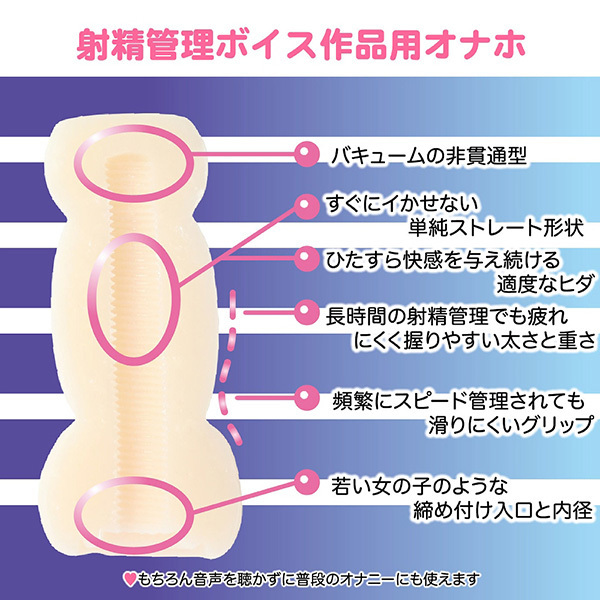 ストーリー性のある射精管理ボイスにより、触覚だけでなく聴覚からも感じることができます!気になるオナホはバキュームタイプの非貫通型♪すぐにはイケない単純ストレート形状とひたすら快感を与え続ける適度なヒダ、頻繁なスピード管理でも滑りにくいグリップと、握りやすいホール外観の太さと重さも良いですね!まるで若い女の子のようなホール入口と締め付けも新鮮♪オナホ単体としても、奥までビッシリと配置された細かなヒダと裏筋によるヒダ名器がたまりません。