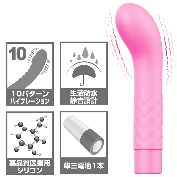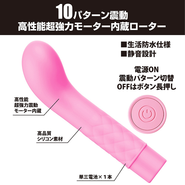 単3電池×1本とボタン1つのシンプル操作で10パターンもの強力振動♪ポコッと出っ張った先端がGスポを直撃、強い快感が貴女をイキ狂わせる!素材には医療で使用される肌に優しいメディカルグレードシリコンを採用。