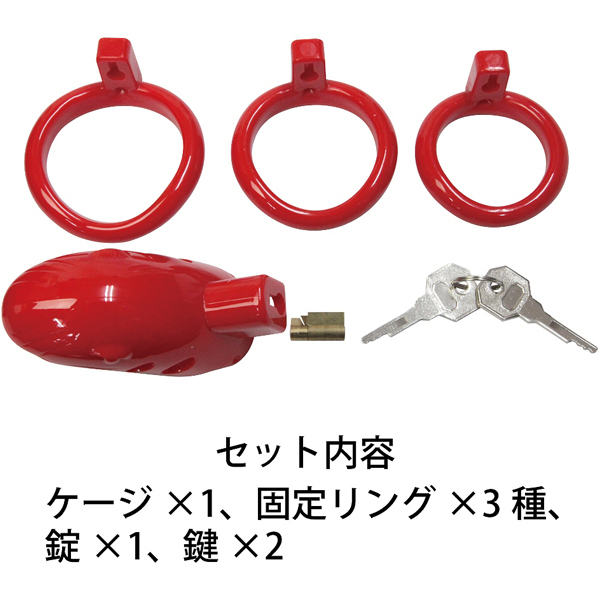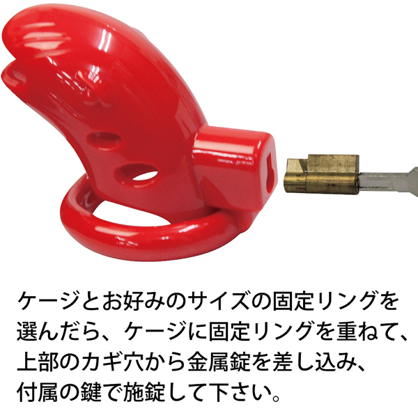 全長7cm、幅3.5cmのケージと3サイズの固定リング(内径4.1cm、4.6cm、5.1cm)で勃起を抑制!鍵を上部に取り付けたことで目立ちにくく邪魔になりにくい♪先端はオープン仕様で装着したままの排泄も可能。