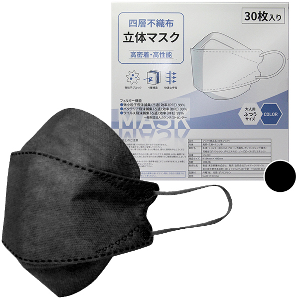 大人用で普通サイズの四層不織布立体マスク(ブラック)です!30枚入りの高性能四層不織布立体マスク。