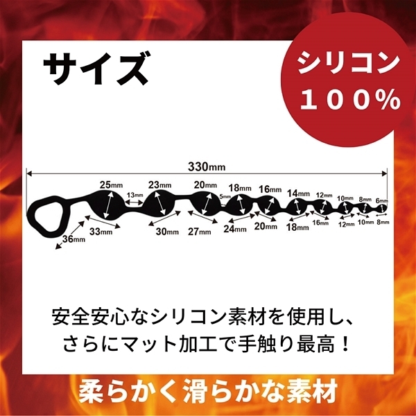 徐々に経が大きくなっていく楕円ボールがイレギュラーに配置されているので挿入時の存在感や引き抜くときの抵抗感がしっかりと感じられるアナルビーズです♪ビーズ初心者にもぴったりなサイズ感で100%ピュアシリコンで作成されているため安心安全!計算され尽くされた形状だから初心者からマニアの方まで楽しめて、意外に最後まで簡単に挿入できる10連アナルビーズとなっております♪100%シリコンなので洗いやすさもバツグンです!