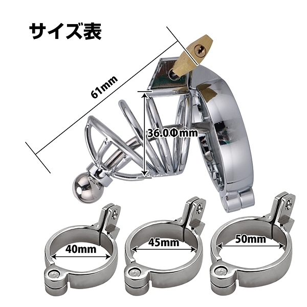 ■仕様:パッケージ:28.0×18.5cm 本体:ペニスゲージ6.1×3.6cm・固定リング小(内径4.0cm)・固定リング中(内径4.5cm)・固定リング大(内径5.0cm) セット内容:ペニスゲージ、固定リング3サイズセット、尿管、南京錠、収納袋