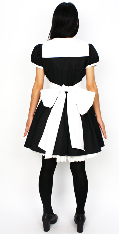 ■仕様:Lサイズ:B87〜98cm・W70〜77cm 丈:ワンピース80cm(袖丈17cm)・ペチコート50cm セット内容:ワンピース(後ろファスナー、袖パフスリーブ、全円スカート、内側に襟固定用のボタン付)・エプロン・ペチコート(裾レース付、ウェストゴム仕様)・カチューシャ・ブローチ(安全ピン付)