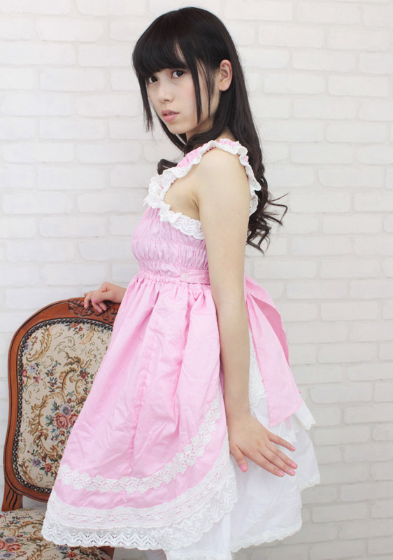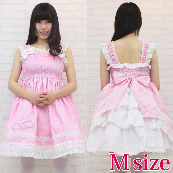 甘ロリピンクが可愛い!豪華なフリルレースで仕上げたシャーリングジャンパースカート(M)。