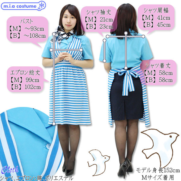 ■仕様:Bサイズ シャツ:B〜108cm・肩幅45cm・袖丈23cm・着丈58cm ジャケット:B〜104cm・肩幅46cm・袖丈59cm・着丈57cm スカート:W〜88cm・H〜102cm・着丈57cm エプロン:総丈102cm スカーフ:89×89cm セット内容:シャツ、ジャケット、スカート、エプロン、スカーフ