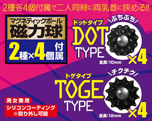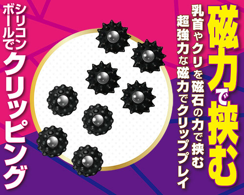 ボディピアスのように穴は開けず、超強力な磁力を使って乳首やクリをクリップ刺激!素材は肌に優しいシリコン製で傷つけにくい♪無数の球体が付いた全長10mmのドットタイプ4個、まきびしのようにトゲトゲとした全長12mmのトゲタイプ4個付属
