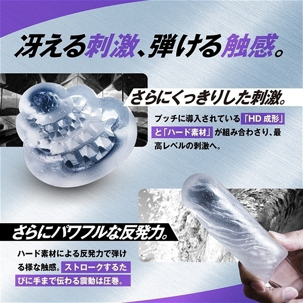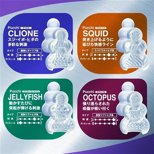 <クリオネ内部構造>「スジ・イボ・ヒダの多彩な刺激」大ぶりの突起たちが全体を大胆に刺激する<ジェリーフィッシュ内部構造>「動かすたびに突起が弾ける刺激」長めに作られた突起が全体を弾いて刺激する<オクトパス内部構造>「張り巡らされた吸盤が吸い付く」吸盤とイボが密着し触感を生み出す<スクイッド内部構造>「突き上げるように延びた触感ライン」大きく隆起をしたスリットが奥へ奥へといざなう