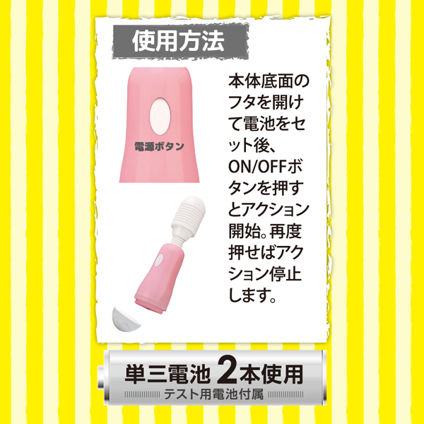柔らかな質感のラバーヘッド&欲しい位置に当てやすい柔軟なフレキシブルネック設計!パターンは一種類でもその振動はかなりパワフル♪力強さと洗練された機能性を兼ね備えた携帯サイズの電マ、自宅はもちろん外出先でも大活躍すること間違いなし!単三電池を2本使用