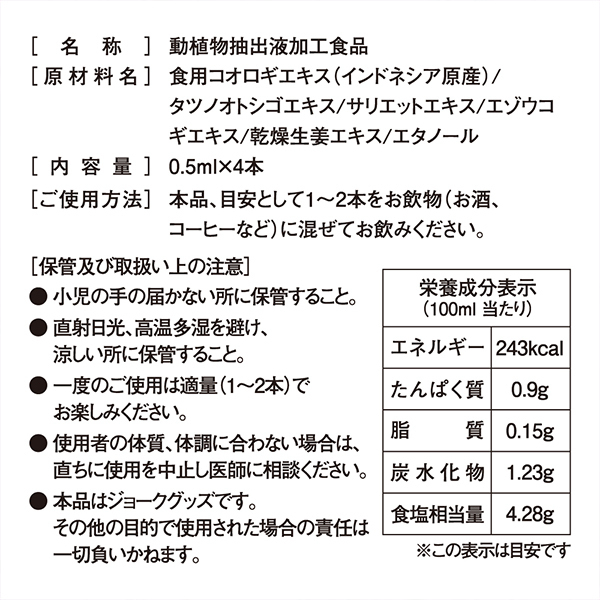 【悪用厳禁】ですよ!人気の女性向けリキッド「濡れアワビ」シリーズに新商品が登場♪お酒やジュースに混ぜて飲もう!スッキリとした味わいでドリンクに混ぜたことも忘れるほどの飲みやすさ♪「原材料名」食用コオロギエキス、タツノオトシゴエキス、サリエットエキス、エゾウコギエキス、乾燥生姜エキス、エタノール。