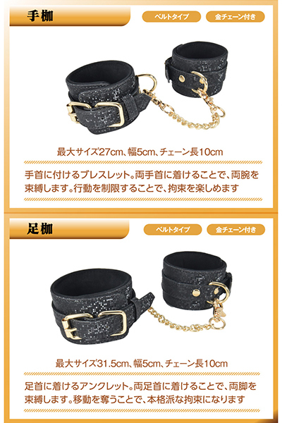 両手を束縛する「手枷」、移動を束縛する「足枷」、そしてSMの代名詞「バラムチ」と、初めてでも大満足なセレクション。