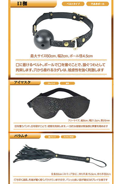 ■仕様:パッケージ:17.0×23.0×6.5cm 本体:アイマスク(縦8cm・横21.5cm・厚さ0.6cm)、口枷(最大サイズ60cm、幅2cm、ボール径4.5cm)、手枷(最大サイズ27cm、幅5cm、チェーン長10cm)、足枷(最大サイズ31.5cm、幅5cm、チェーン長10cm)、バラムチ(全長50cm、持ち手長さ15.5cm、持ち手径2cm)